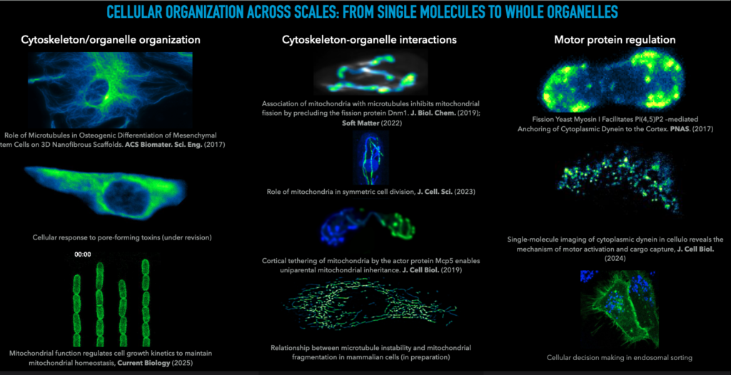 Cells employ tiny machines called ‘motor proteins’ to carry out a myriad of functions including maintenance of cellular organisation, transport of substances across the cell, and generation of forces required for cell division. These activities of motor proteins are facilitated by polymers inside the cell termed ‘microtubules’. Microtubules function as tracks for motor movement, and alternately as ropes which motor proteins pull on. Several cellular processes require a coordination of motor proteins and microtubules. Scientists have gained a wealth of information by replicating cellular processes involving motors and microtubules outside living cell, in what are called ‘in vitro’ experiments. However, understanding the complex intracellular milieu within which motors operate to organise the cell remains an elusive quest. A thorough investigation of processes regulating motors and microtubules therefore lets us see how these processes unravel in both contexts of health and disease (including neurodegeneration and cancers), where they go rogue.